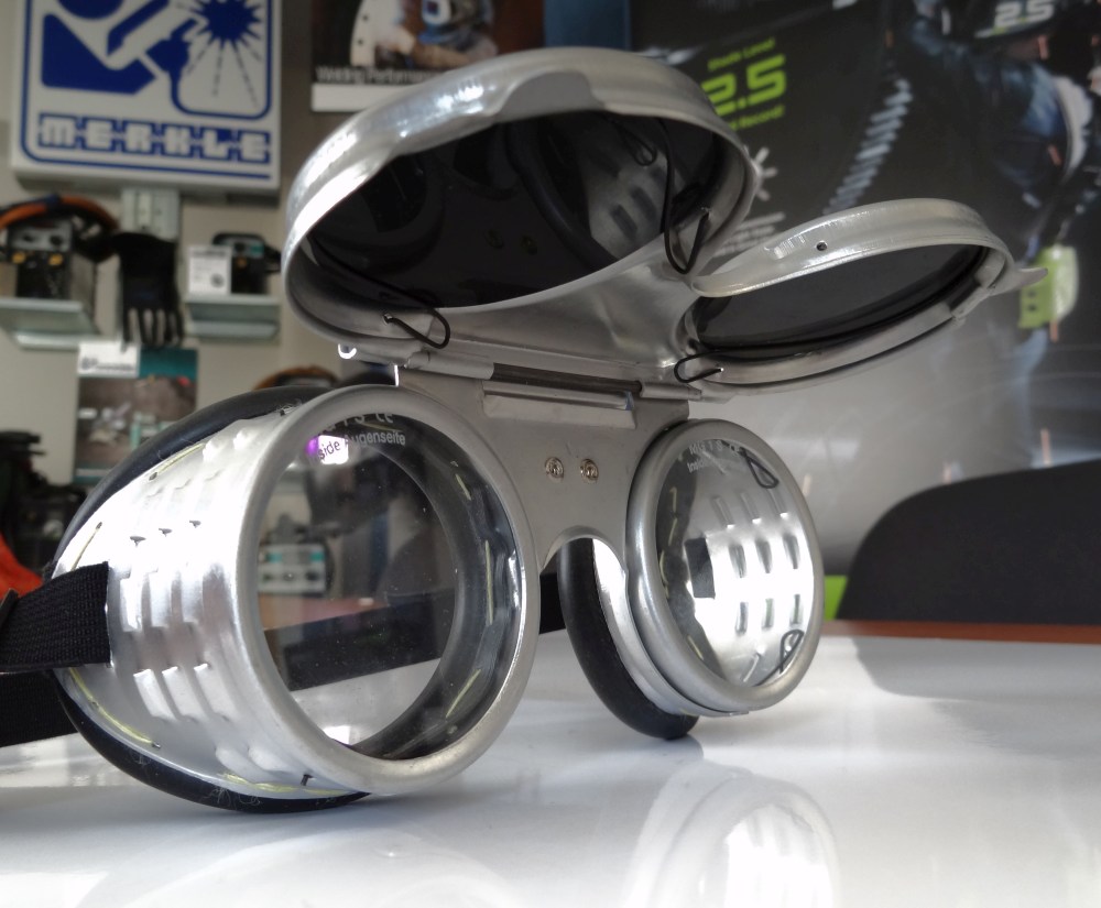 Pevná část je osazena lepenými čirými skly, odklápěcí pak tmavými skly DIN 5. Očnice jsou obšité silikonovou pryží.